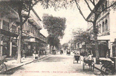 Une carte postale de Saïgon, Cochinchine, Viet Nam, en 1920. Ici l'on voit la rue Catinat près du théâtre. Voici le lien d'une photo de la même rue avec le même point de vue mais prise à un autre moment.